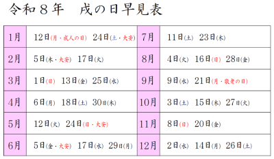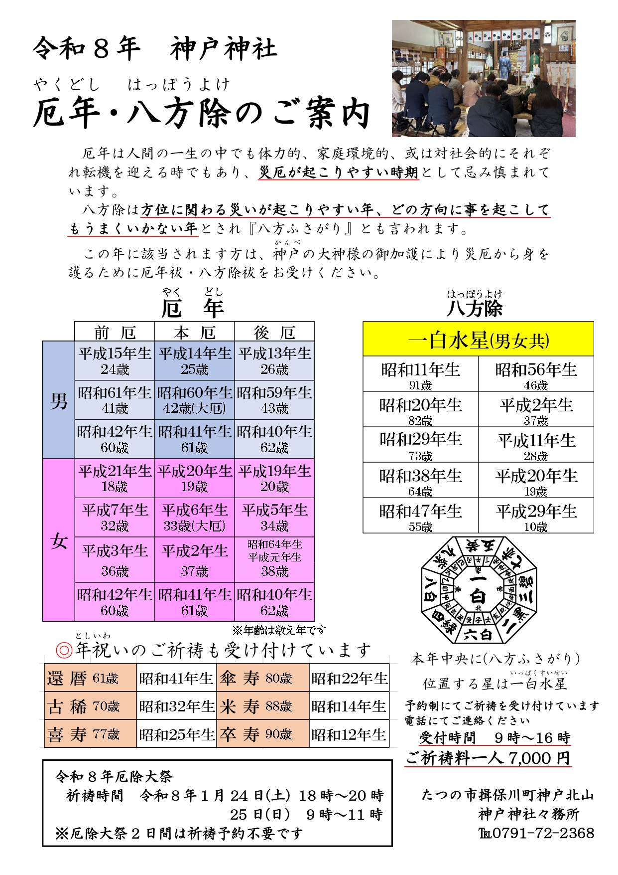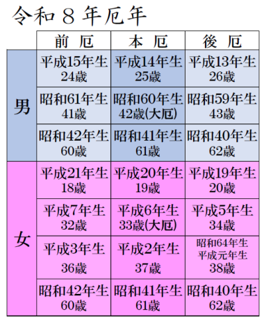 | 厄除祈願 | 厄年は人間の一生の中でも体力的、家庭環境的、あるいは対社会的にそれぞれ転機を迎える時でもあり災厄が起こりやすい時期として忌み慎まれております。 八方除は九年に一度、四方八方など方位に関わる災いが起こりやすい年とされ『八方ふさがり』とも言われます。 この年に該当されます方は神様の御加護により災厄から身を護るために厄年祓・八方厄除祓をお受け頂きますようご案内申し上げます。 ![]() ![]() ![]() ☆令和8年厄年・八方除のご案内 |