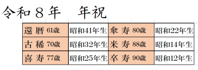 | 年祝 | 節目の祝い年を迎えた事を神様に奉告、感謝申し上げると共に、更なる健康、長寿と御家族の安泰をお祈りする儀式です。![]() |